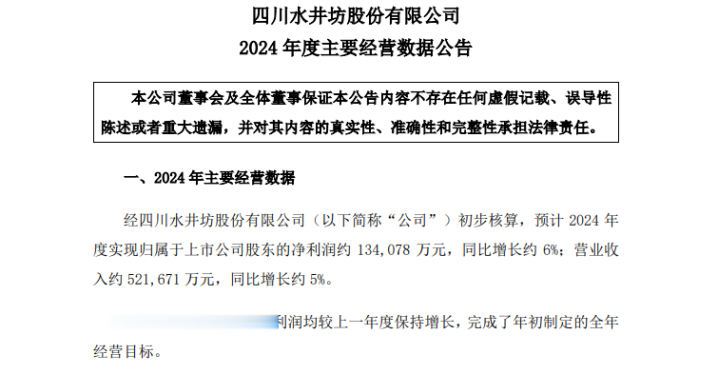 水井坊春节前发布的公告显示,公司预计2024年实现营收约52.2亿元,同比增长约5%;预计实现归属于上市公司股东的净利润约13.4亿元,同比增长约6%。